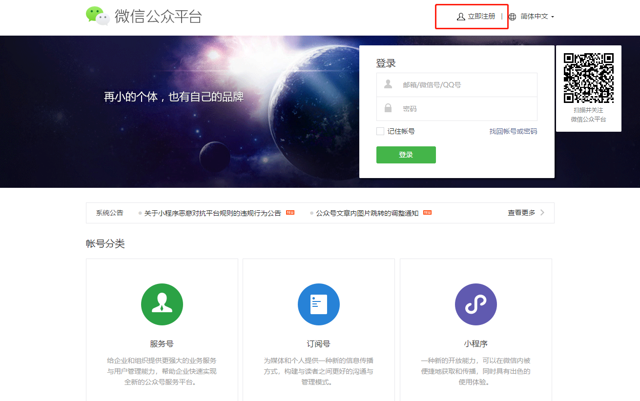 了解訂閱號(hào)、服務(wù)號(hào)和企業(yè)微信的區(qū)別后,選擇想要的帳號(hào)類型;
