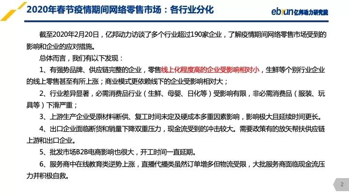 針對疫情期間網(wǎng)絡(luò)零售市場受到的具體影響及企業(yè)的應(yīng)對措施,億邦動力研究院出品了一份快報。該報告既涵蓋了多個行業(yè)的詳情及企業(yè)案例,也提供了網(wǎng)絡(luò)零售市場疫情后續(xù)趨勢的預(yù)判。